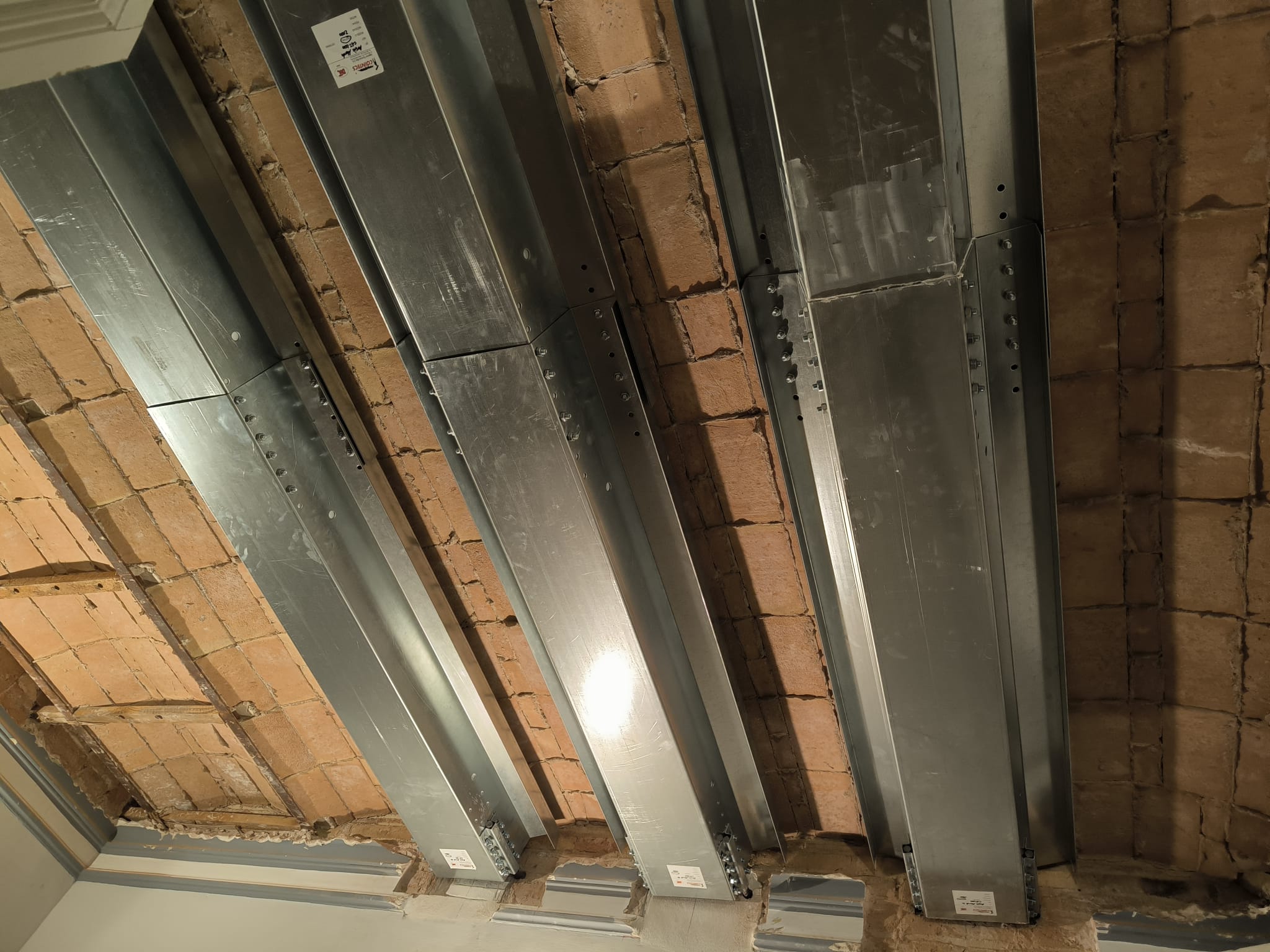 La intervención se resolvió mediante la instalación de perfiles metálicos telescópicos del sistema Modelo CES, diseñados para asumir parte de las cargas del forjado existente y reducir las tensiones en las viguetas originales.