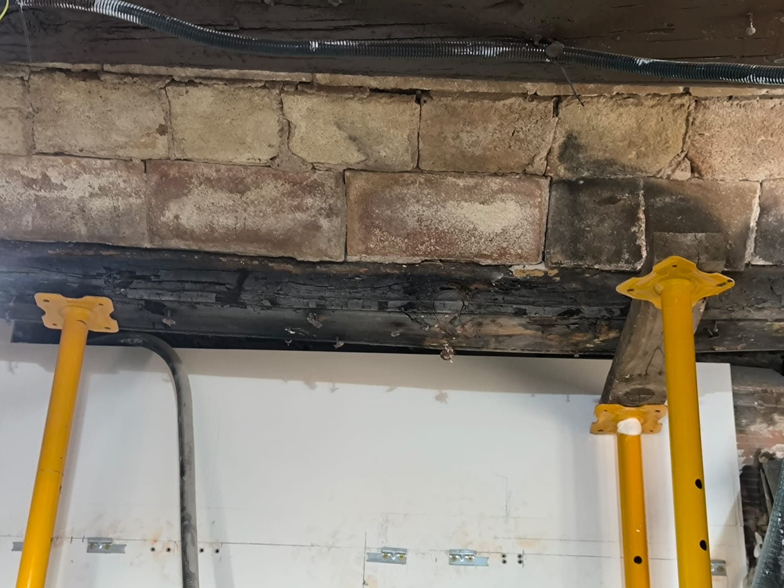 Durante la inspección del forjado se detectó un deterioro avanzado en varias vigas de madera que formaban parte de la estructura original del edificio. La exposición prolongada a la humedad y el envejecimiento natural del material habían provocado pérdida de sección, degradación superficial y debilitamiento estructural.