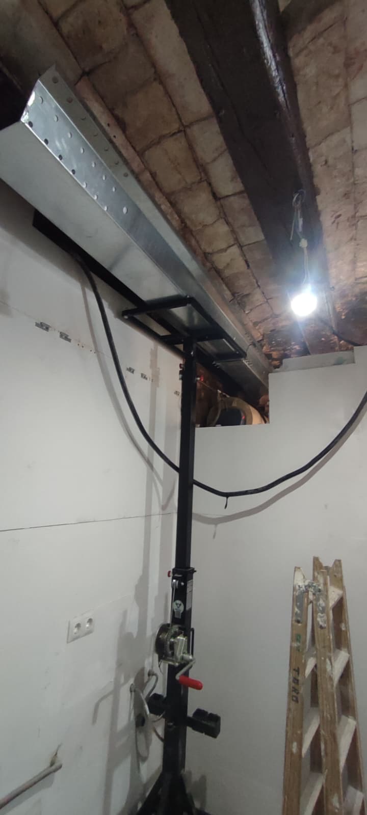 La intervención se resolvió mediante la instalación de mecanovigas metálicas telescópicas del Modelo CES, colocadas paralelamente a las vigas de madera existentes.