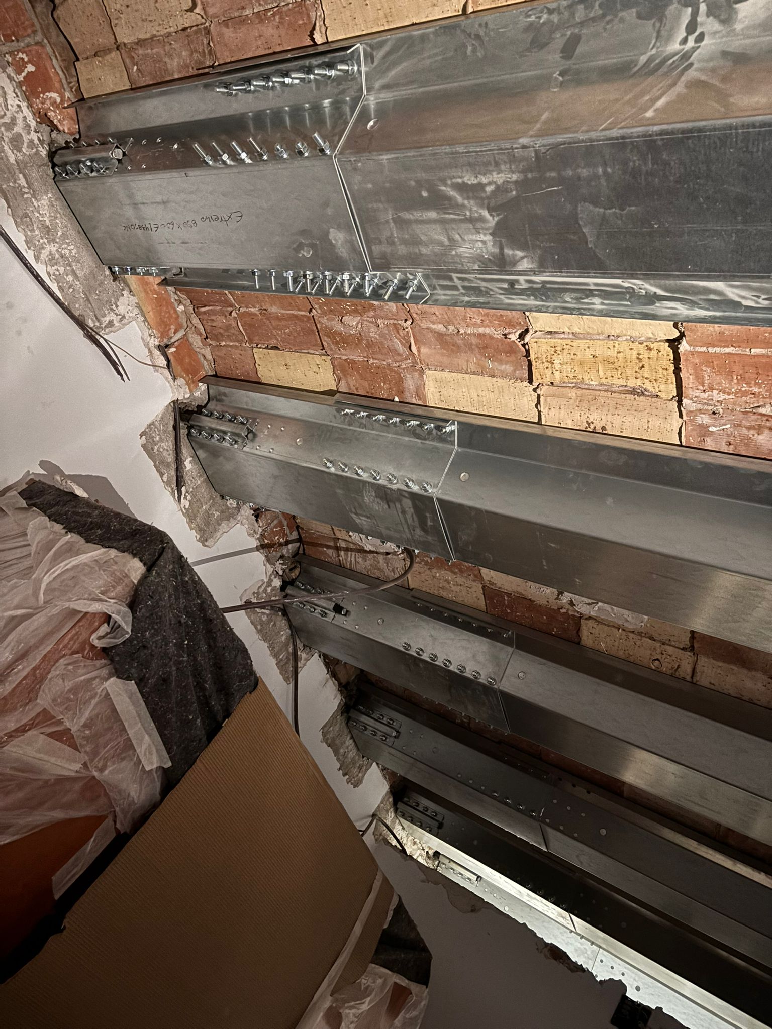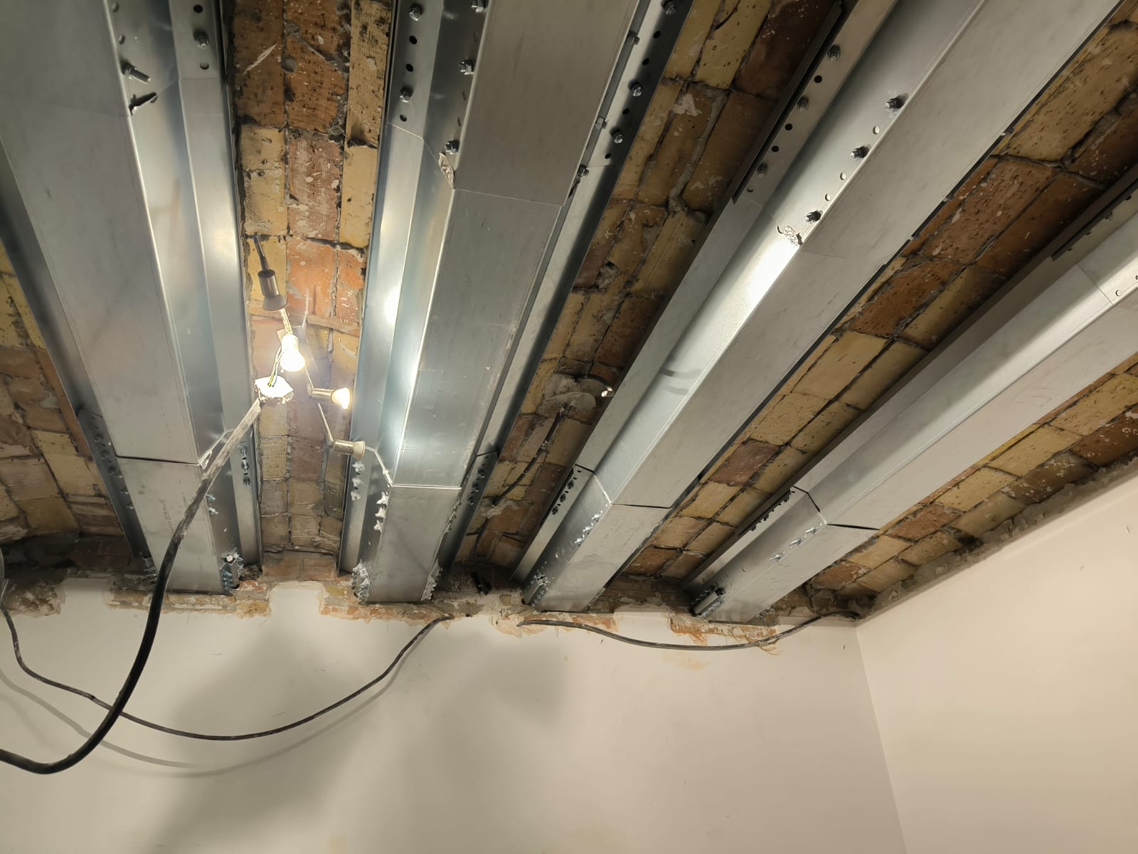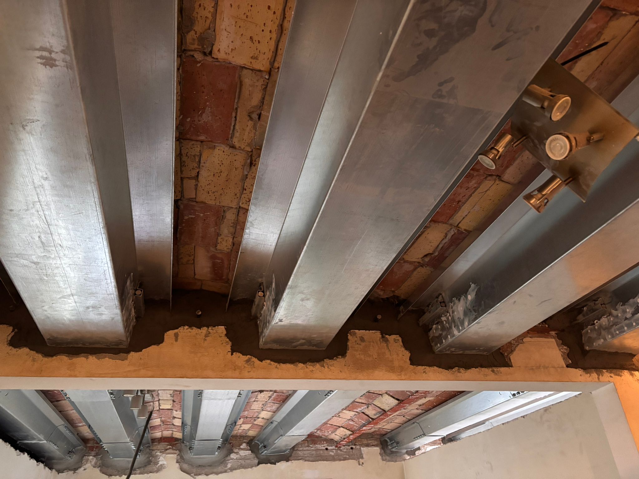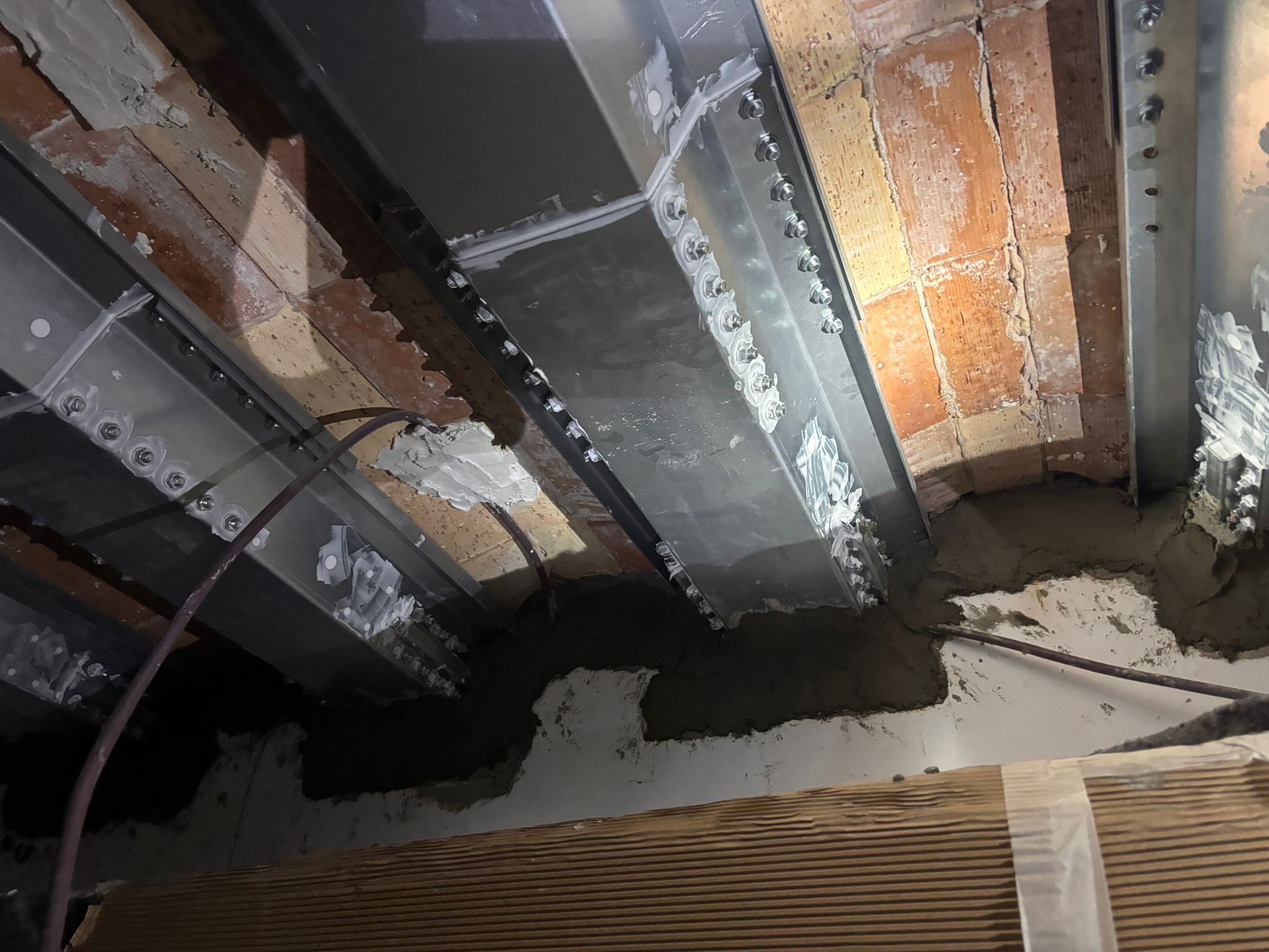Las mecanovigas se instalaron en la cara inferior de las vigas existentes, apoyadas sobre soportes metálicos anclados a los elementos portantes del edificio. Posteriormente se rellenó el perfil con mortero estructural de alta resistencia, creando un conjunto rígido que mejora la estabilidad del forjado y garantiza la seguridad estructural del edificio.